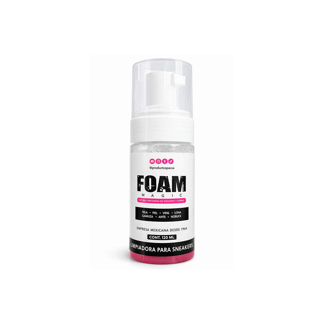 La Foam Magic de PACSA es una fórmula de alta eficiencia diseñada para limpiar de manera profunda y segura todo tipo de calzado y gorras, así como artículos de piel, tela, plástico, piel sintética, nobuk, gamuza, ante y hule. Su fórmula avanzada no daña ni reseca los materiales, garantizando un cuidado profesional en cada aplicación.